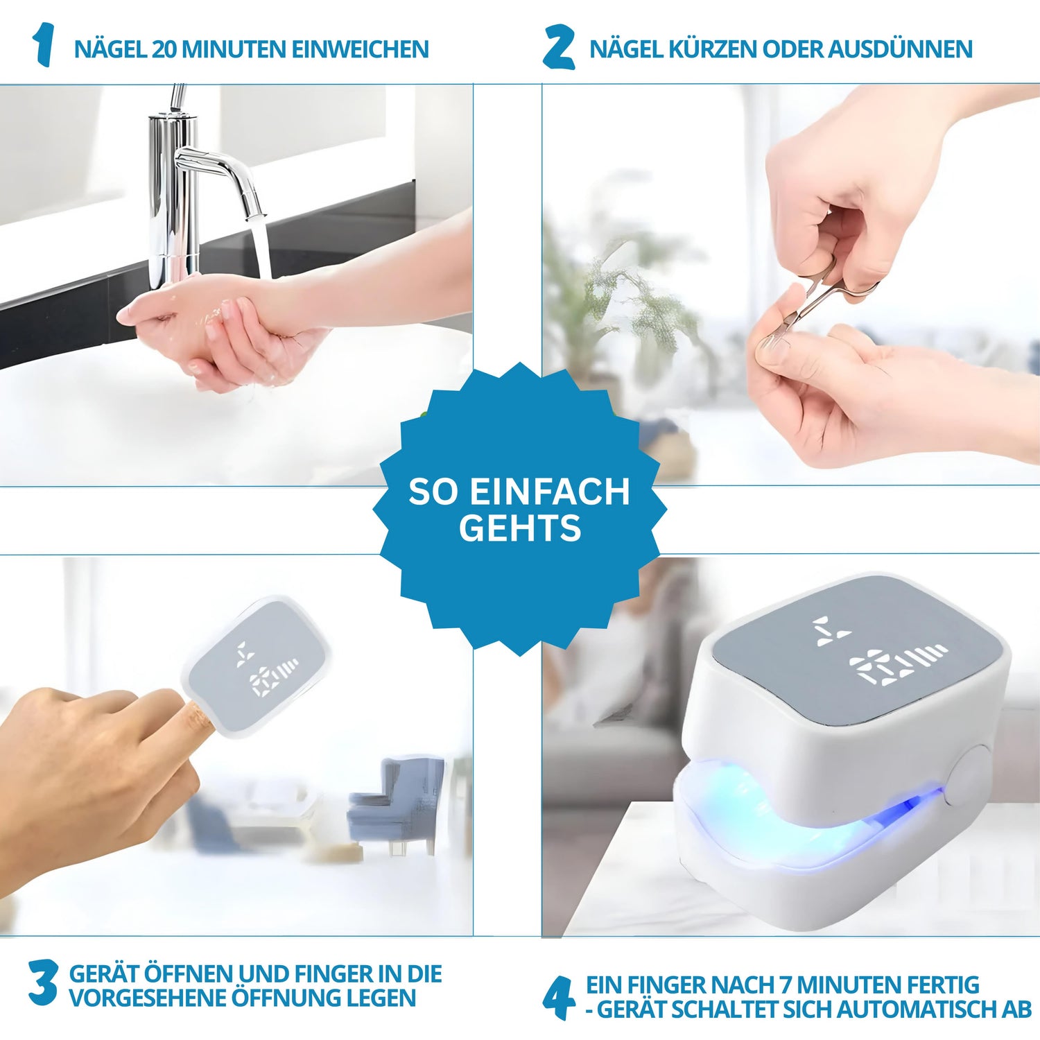 Wir empfehlen 2x tägliche Anwendung von 7 Minuten pro betroffener Stelle. Erste sichtbare Verbesserungen zeigen sich in der Regel nach 3-4 Wochen – je nach Stärke des Befalls und individuellem Nagelwachstum. Für optimale Ergebnisse empfehlen wir eine Anwendung über mindestens 3-6 Monate.